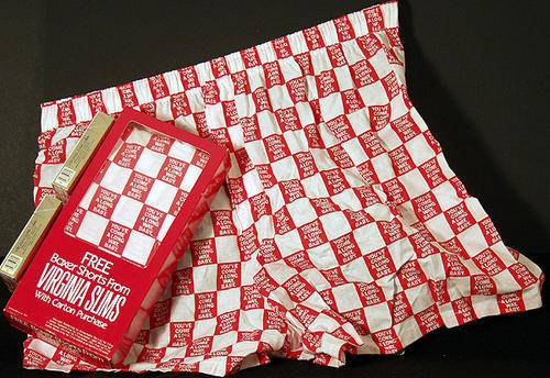 Free boxer shorts from Virginia Slms wit carton purchase. Boxers are red and white, checkerboard. You've come a long way baby written in white inside red squares.