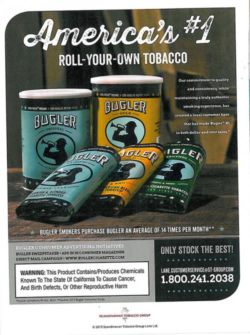 Magazine ad from Bugler advertising their roll-your-own tobacco as America's #1. The ad includes an image of three different products- Bugler Original, Bugler Gold, and Bugler Menthol. The ad also mentions that "Bugler smokers purchase Bugler an averiage of 14 times per month."