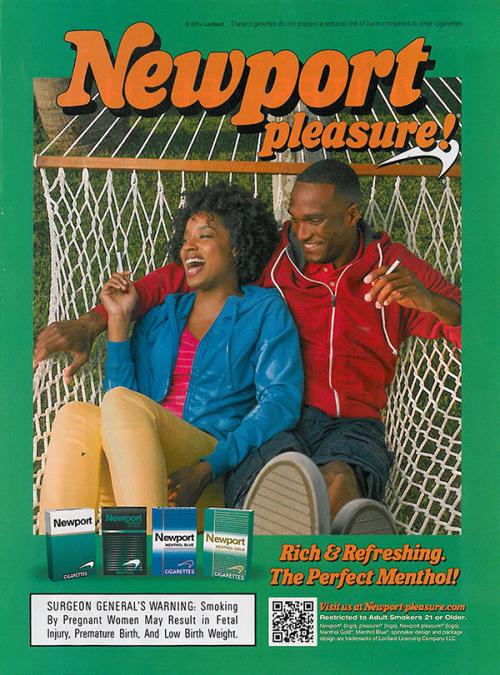 Magazine ad from Newport advertising their original, Smooth Select, Menthol Blue, and Menthol Gold products. The ad contains an image of an African American couple smoking together on a hammock. Text: "Newport pleasure!" "Rich & Refreshing. The Perfect Menthol!"