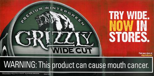 Magazine ad from Grizzly advertising their new Wide Cut Windergreen Product. The ad is a six page fold out. The first page says: "Wider Means Bolder Flavor." When the ad is opened, the next page says: "The Wider Wintergreen is Here." Unfolding the ad completely reveals a three page spread of an image of the product and text: "Try Wide. Now in Stores." On the back page of the ad there is another image of the product with text: "Enjoy the Bold Taste of Wide Cut Wintergreen."