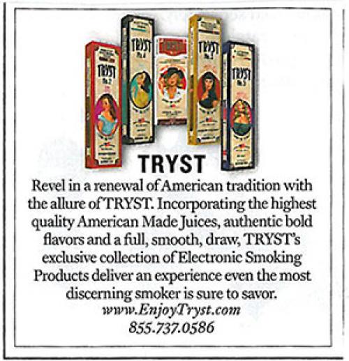 Tryst electronic-cigarette magazine ad promoting their 5 e-cig products. Magazine ad is a 1/12 page ad and features sultry, retro style pin up girls. Text: "Revel in a renewal of American tradition with the allure of TRYST. Incorporating the highest quality American Made Juices, authentic bold flavors and a full, smooth, draw, TRYST's exclusive collection of Electronic Smoking Products deliver an experience even the most discerning smoker is sure to savor. www.enjoytryst.com."