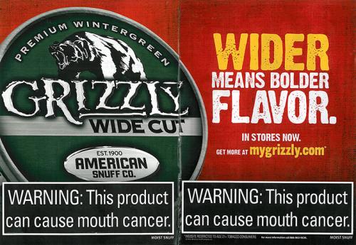 Two-page magazine ad from Grizzly promoting its new wide-cut product. Text: "Wider means bolder flavor. In stores now. Get more at mygrizzly.com."