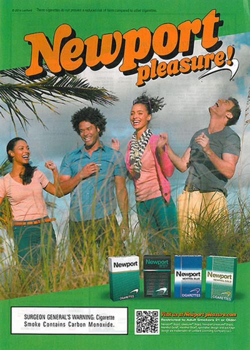 Magazine ad from Newport promoting their signature menthol cigarettes. Ad features four people - two women and two men - who appear to be at the beach as two couples. All individuals appear to be of mixed race and are standing in the sand dunes.
