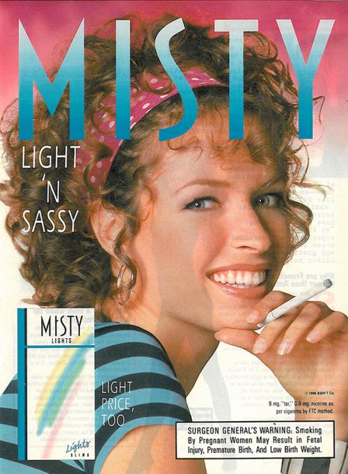 Magazine ad from Misty advertising their product with an image of a woman smoking as well as an image of a pack of Misty Lights. Text: "Light 'N Sassy," "Light price, too."
