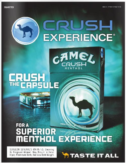 Magazine ad from Camel advertising their Camel Crush Menthol product. The ad contains one main image of the pack of cigarettes next to a lighter. Text: "Crush the Capsule for a Superior Menthol Experience."