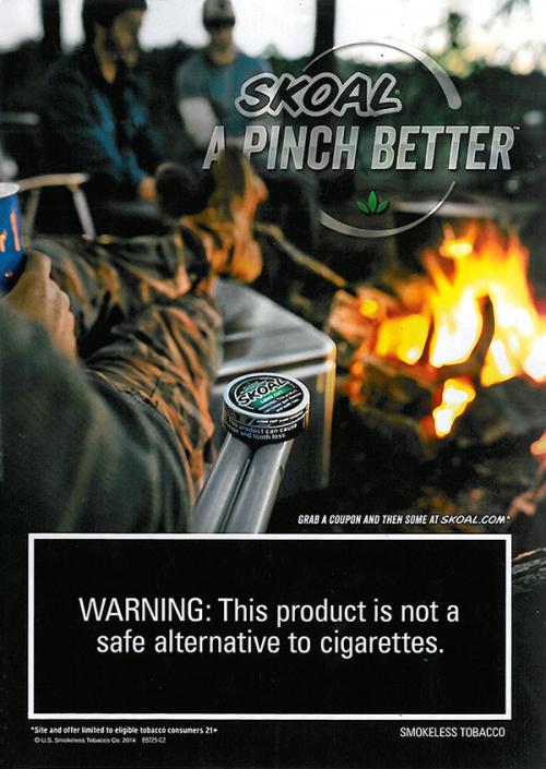 Magazine ad from Skoal advertising their Long Cut Wintergreen product. The ad shows an image of men gathered around a camp fire with a can of Skoal in the foreground resting on one man's chair. The ad directs to the brand's website to "grab a coupon and then some." Text: "Skoal. A Pinch Better."
