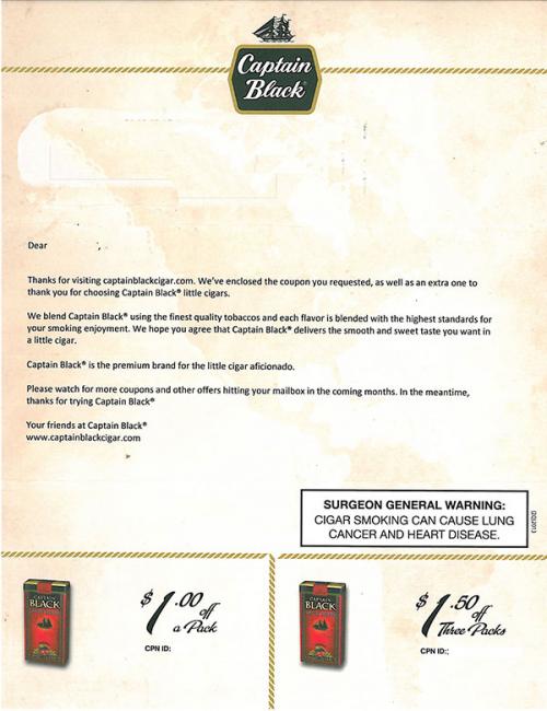 Direct mail from Captain Black received in March 2014 delivering coupons the receiver requested on the brand's website. The piece is in the form of a letter addressed to the receiver, thaking them for trying Captain Black.
