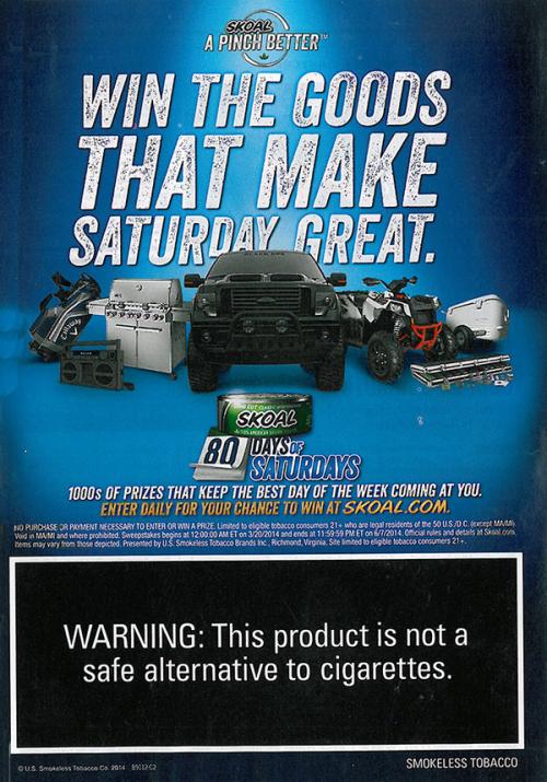 Magazine ad from Skoal advertising their 80 Days of Saturdays Sweepstakes. The ad features images of some of the many prizes including items such as a truck, a barbeque, golf clubs, etc. Text: "Win the goods that make Saturday Great. 1000s of prizes that keep the best day of the week coming at you. Enter daily for your chance to win at Skoal.com."