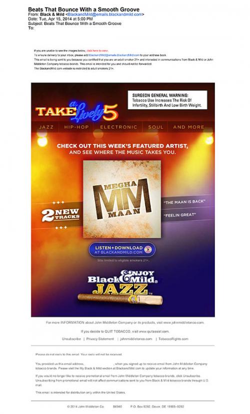 Email from Black and Mild received on April 15, 2014 inviting the receiver to their website to "check out this week's featured artist, and see where the music takes you." The piece includes the names of the two new tracks.