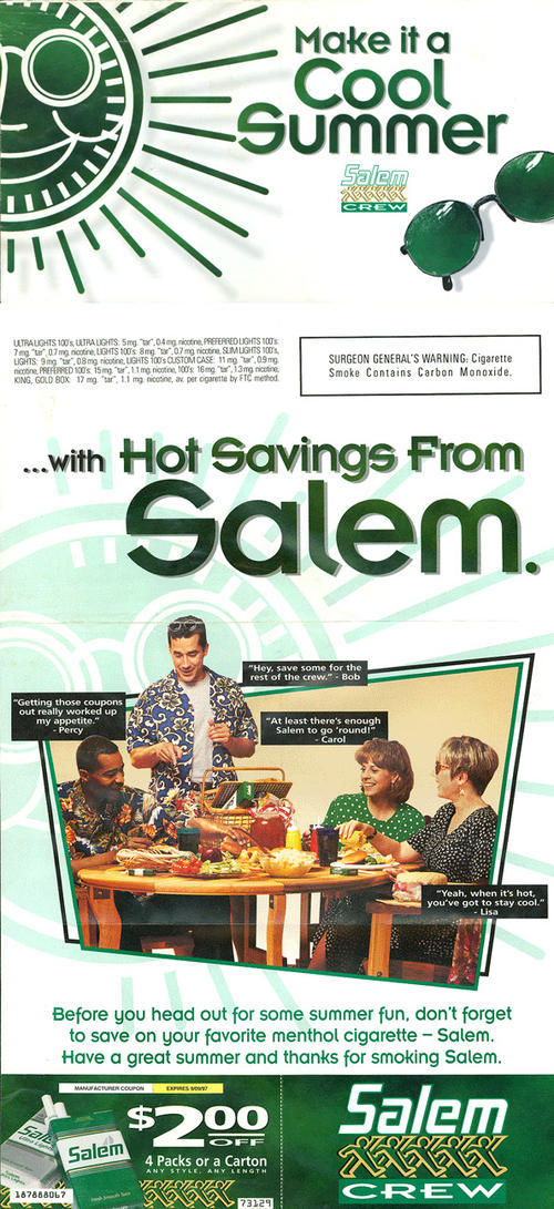 Make it a cool summer Salem Crew mailing. Coupons embossed with Hot Savings of $2.00 off 4 packs or a carton. Stay Cool with the Crew text on carton of mailing.