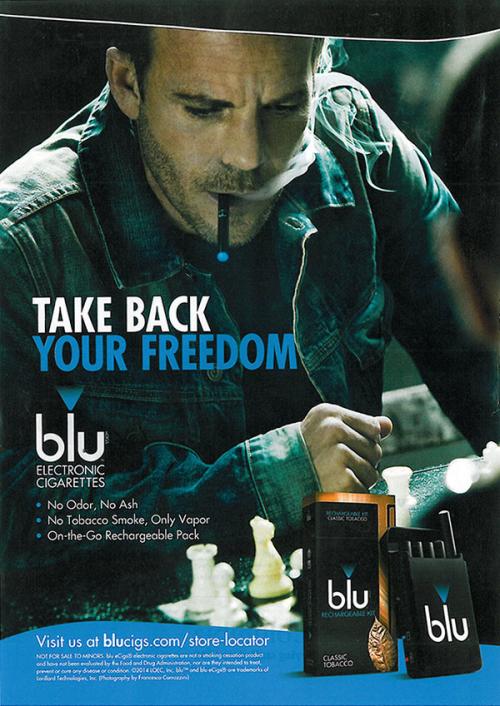 Magazine ad from Blu featuring Stephen Dorff smoking a Blu e-cigarette while playing chess. The ad also features an image of the Blu rechargeable kit and text: "Take Back Your Freedom."