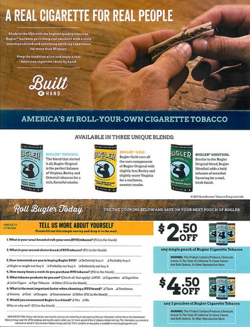 Direct mail from Bugler received in May 2014 advertising their product. The piece includes images of peoples' hands rolling and smoking Bugler products and features text such as "Enjoy a Real American Cigarette" and "A Real Cigarette for Real People." The piece also includes a survey for the receiver to fill out and two coupons for Bugler products.