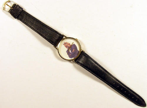 Wristwatch; Gold and White face with Image of Joe Camel in a suit. Black leather band.