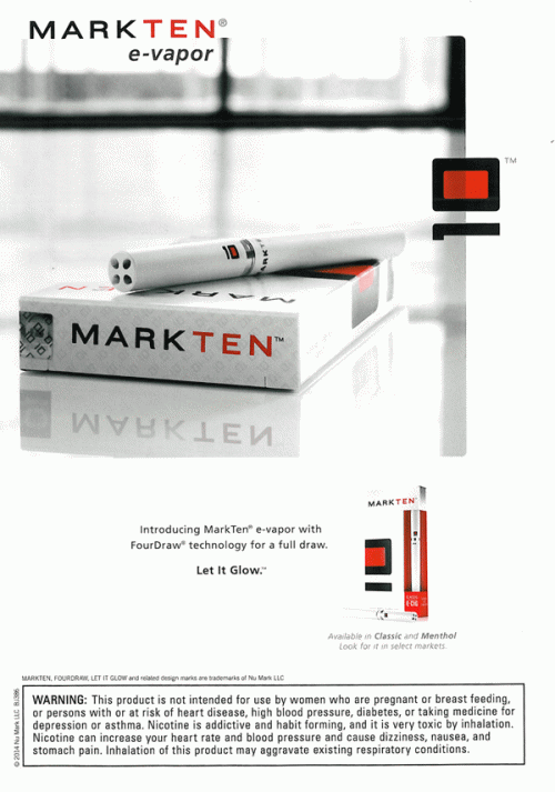 Magazine Ad from MarkTen promoting their new e-vapor with FourDraw technology. Text: "Introducing MarkTen e-vapor with FourDraw technology for a full draw. Let It Glow."