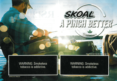 Magazine Ad from Skoal featuring men in a lake fishing. Ad encourages readers to "Grab a coupon and then some at skoal.com" Text: "Skoal A Pinch Better."