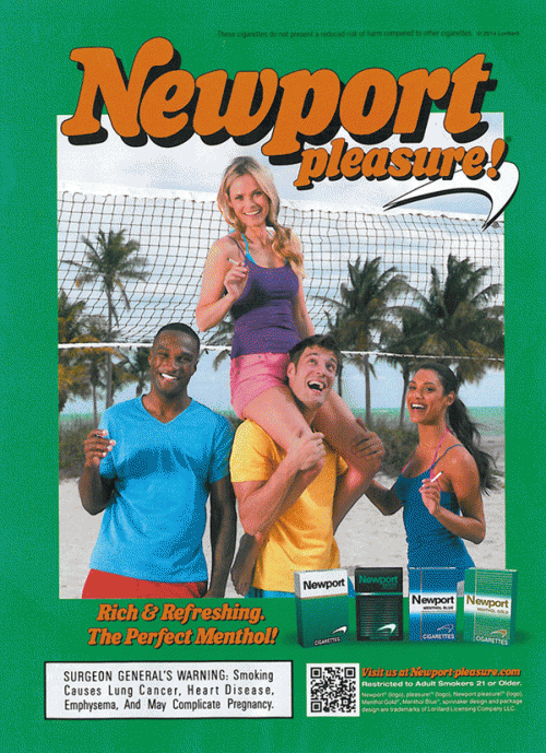 Magazine Ad from Newport featuring two men and two women on the beach holding cigarettes in front of a volleyball net. Text: "Rich & Refreshing. The Perfect Menthol!"