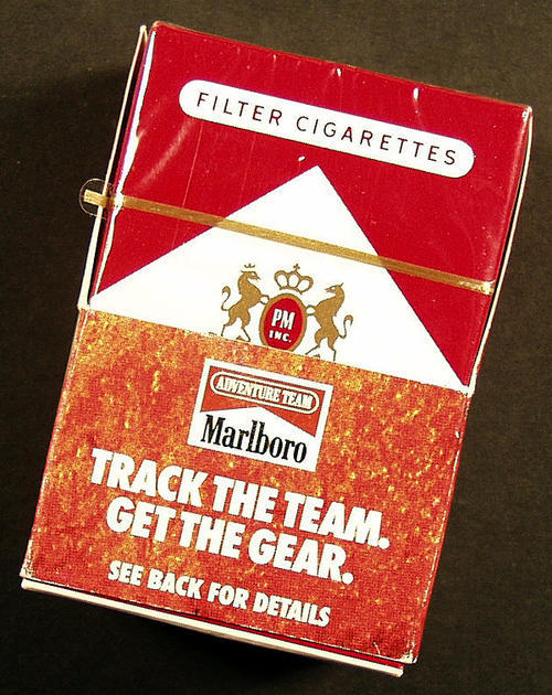 2 Marlboro red packs with ad for "adventure team miles for official gear"; "Track the team. Get the gear." Red Rock Design of cardboard wrap.