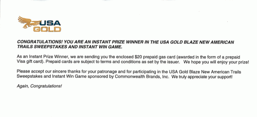 USA Gold Blaze New American Trails Sweepstakes and Instant Win Game. The piece includes a gift of a $20 prepaid gas card (in form of a prepaid Visa gift card)