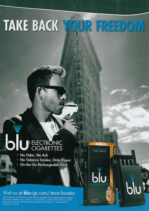 Blu Magazine ad featuring Stephen Dorff smoking a Blu e-cigarette outside a building in New York City. The ad also features an image of the Blu rechargeable kit. Text: "Take Back Your Freedom."