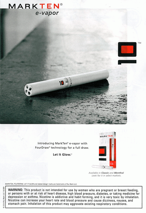 Magazine Ad from MarkTen promoting their new e-vapor with FourDraw technology. Text: "Introducing MarkTen e-vapor with FourDraw technology for a full draw. Let It Glow."