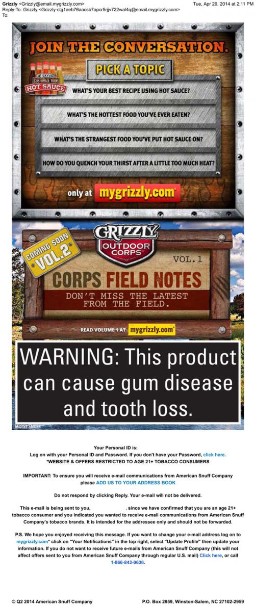 This email from Grizzly was sent on April 29, 2014 and it tells receivers to go on the website and talk about all things related to hot sauce. It also shows an update on the Grizzly outdoor corps and promotes it by providing the link to read the first volume. Text: "Join the Conversation: Pick a Topic" & "Corps Fields Notes: Don't Miss the Latest from the Field".