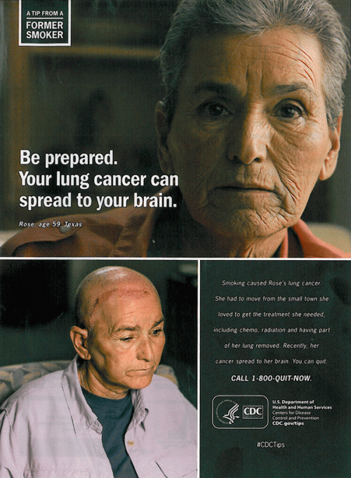 national Tips from a Former Smoker campaign. The ad features an image of Rose who had lung cancer as a result of smoking causing her to undergo chemo, radiation and having part of her lung removed. Text: "Be prepared. Your lung cancer can spread to your brain."