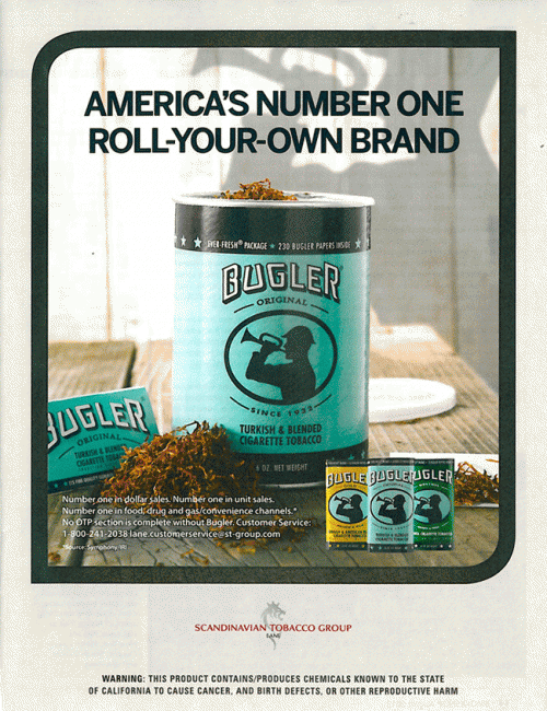 Bugler advertising their roll-your-own tobacco as America's Number One brand. The ad mentions, "Number one in dollar sales. Number one in unit sales. Number one in food, drug and gas/convenience channels.* No OTP section is complete without Bugler."