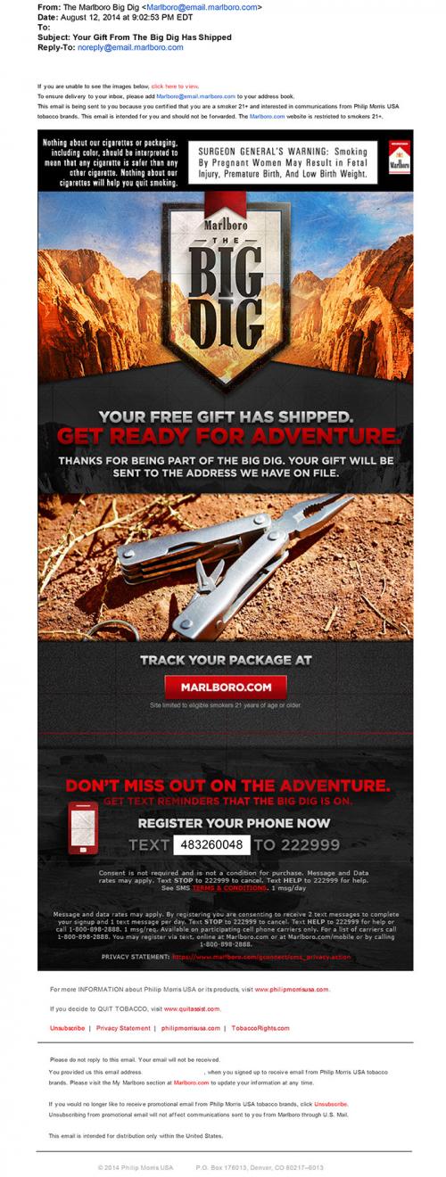 Marlboro sent this email on August 13, 2014 to a receiver as a notification that the receiver's gift from the Big Dig has been shipped, and it includes a link to track the package, as well as the address it has been sent to. Marlboro also promotes the Big Dig by offering text reminders.