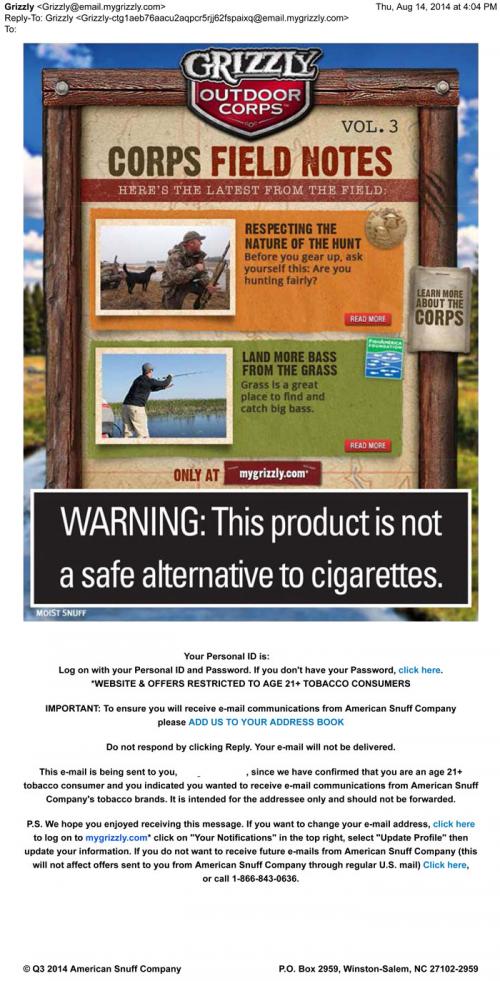 Grizzly sent Volume 3 of its Outdoor Corps Edition on August 14, 2014. The "Corps Fields Notes" includes two links to blog posts on the brand's website. One post discusses fairness in hunting while another blog post shares fishing advice for people interested in fishing.
