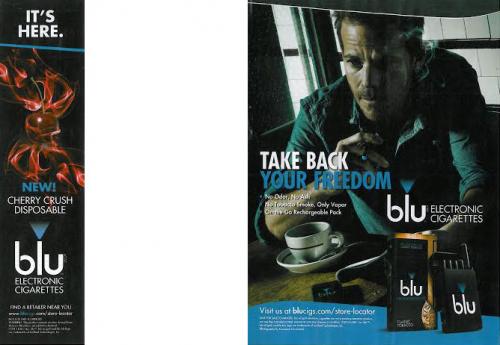 One and one-third page, magazine ad from Blu featuring Stephen Dorff smoking a Blu e-cigarette while drinking coffee. The ad also feautres an image of the Blu rechargeable kit and text: "Take Back Your Freedom."