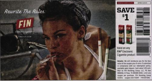 A FIN "SAVE $1" coupon displays the FIN model vaping an e-cigarette. It includes a barcode and you can use it on any one FIN electronic cigarette product.