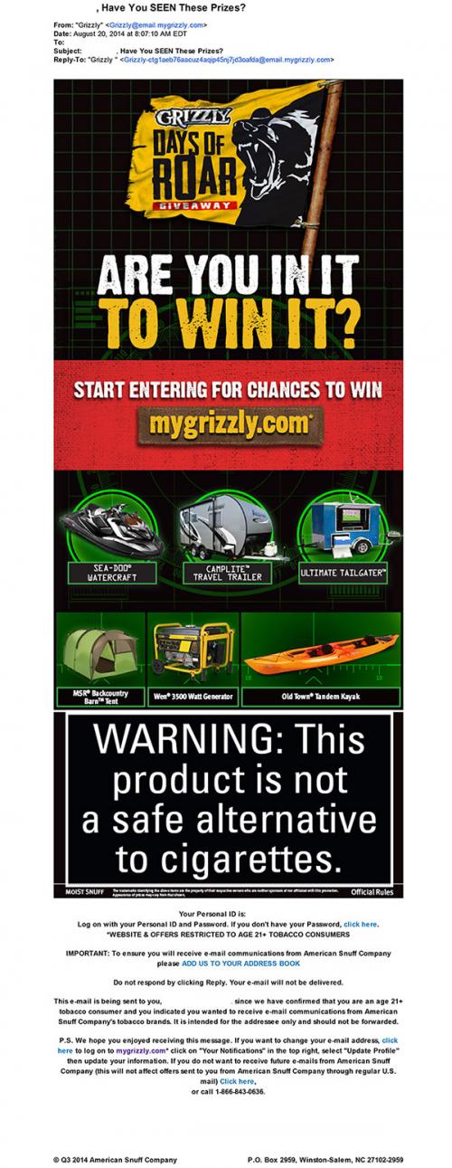 Email received from Grizzly in August 2014 inviting the receiver to go to the brand's website to enter sweepstakes for a chance to win prizes from Grizzly's Days of Roar Giveaway. Text: "Grizzly Days of Roar Giveaway. Are you in it to win it? Start entering for chances to win.”