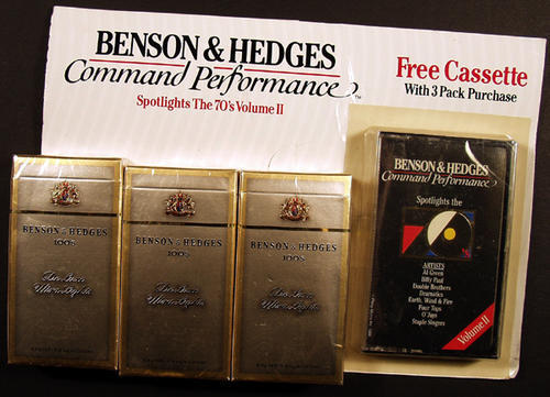 Benson & Hedges Commend Performance Spotlights the 70's Volume II. Free cassette with 3-pack purchase of Benson & Hedges 100's Deluxe Ultra Lights.