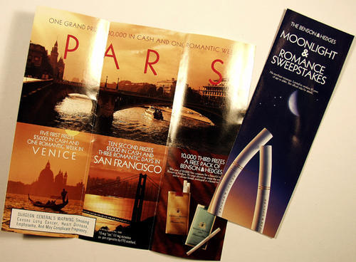 The Benson & Hedges Moonlight & Romance sweepstakes brochure. Two Cigarettes illustrated on front standing beneath the stars and moonlight.