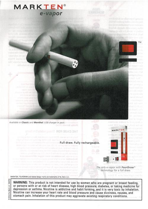 Magazine ad from MarkTen with text "Full draw. Fully rechargeable."  Picture shows hand holding e-cigarette. Small picture shows product and USB charger with MarkTen symbol on it. Additional text says "Available in Classic and Menthol.  USB charger in pack."