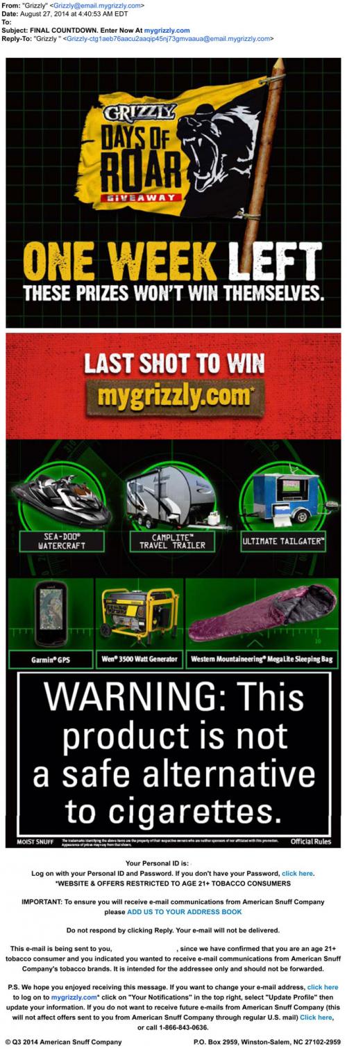 E-mail Smokeless Tobacco Sweepstakes