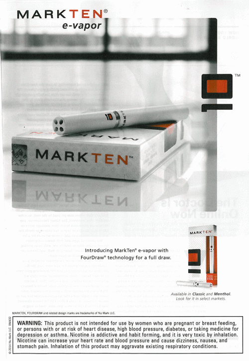 Magazine Ad from MarkTen promoting their new e-vapor with FourDraw technology. Text: "Introducing MarkTen e-vapor with FourDraw technology for a full draw."