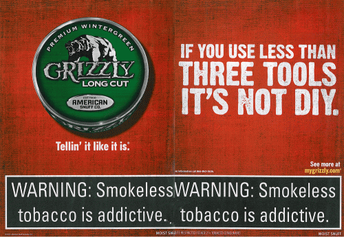 "Tellin' it like it is" ad from Grizzly promoting their Premium Wintergreen Long Cut product. Text: "If You Use Less Than Three Tools It's Not DIY."