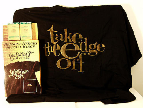 Benson & Hedges Special Kings Free Pocket "T" with 2 packs. Black T-shirt with gold text on front. T shirt says: "take the edges off."