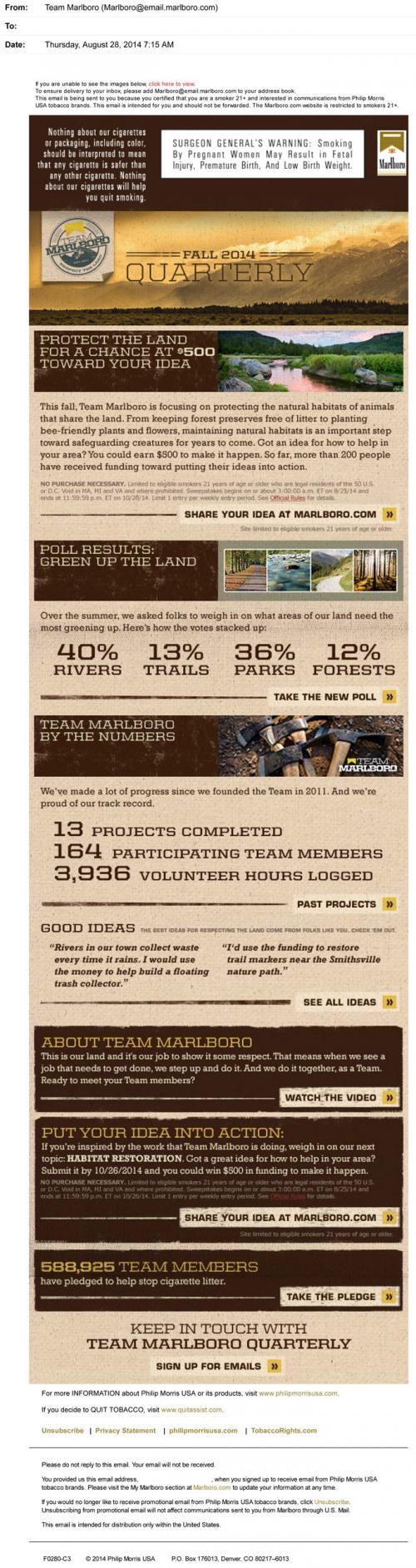 Marlboro in August 2014 inviting the receiver to visit the brand's website