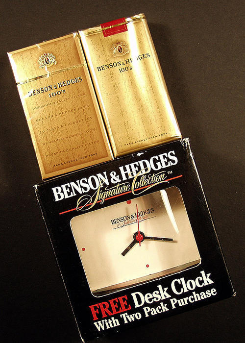 Benson & Hedges Signature Collection free desk clock w/ 2 pack purchase. Benson & Hedges 100's. Black box with white clock face visible. No digits on face, only for far red dots including only quarter hour.