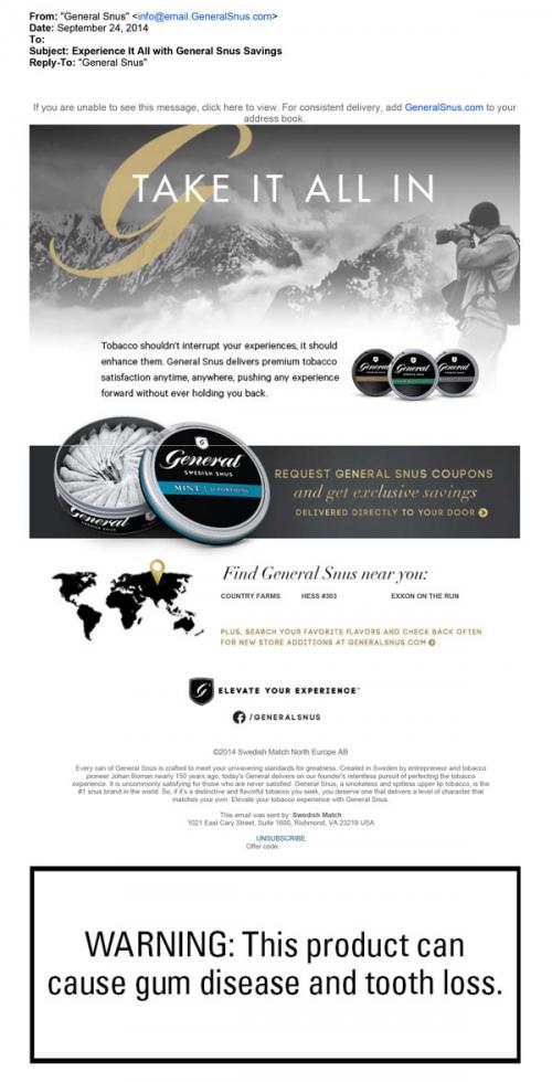 Email received from General Snus in September 2014 inviting the user to the brand website for coupons and conveniently lists the nearest stores where General Snus is available using receiver's provided address. Text: "Take it all in. Tobacco shouldn't interrupt your experiences, it should enhance them. General Snus delivers premium tobacco satisfaction anytime, anywhere, pushing any experience forward without ever holding you back."