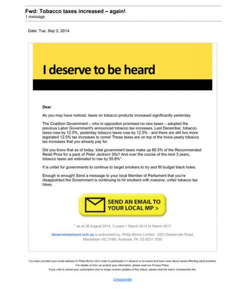Email sent from Philip Morris to receiver in September 2014 informing the receiver of increases in tobacco taxes. It urges the receiver to send an email to their local member of Parliament to express their anger about being "targeted" with new or increased taxes. E-mail belongs to the company's "I deserve to be heard" campaign.