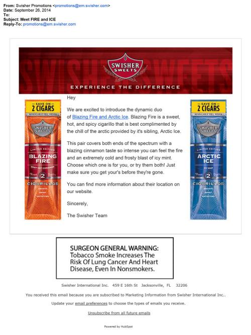 Email received from Swisher on September 26, 2014 introducing two new flavors, Blazing Fire and Artic Ice. Advertises the flavors as a dynamic duo of spicy hot cinnamon and cool icy mint.