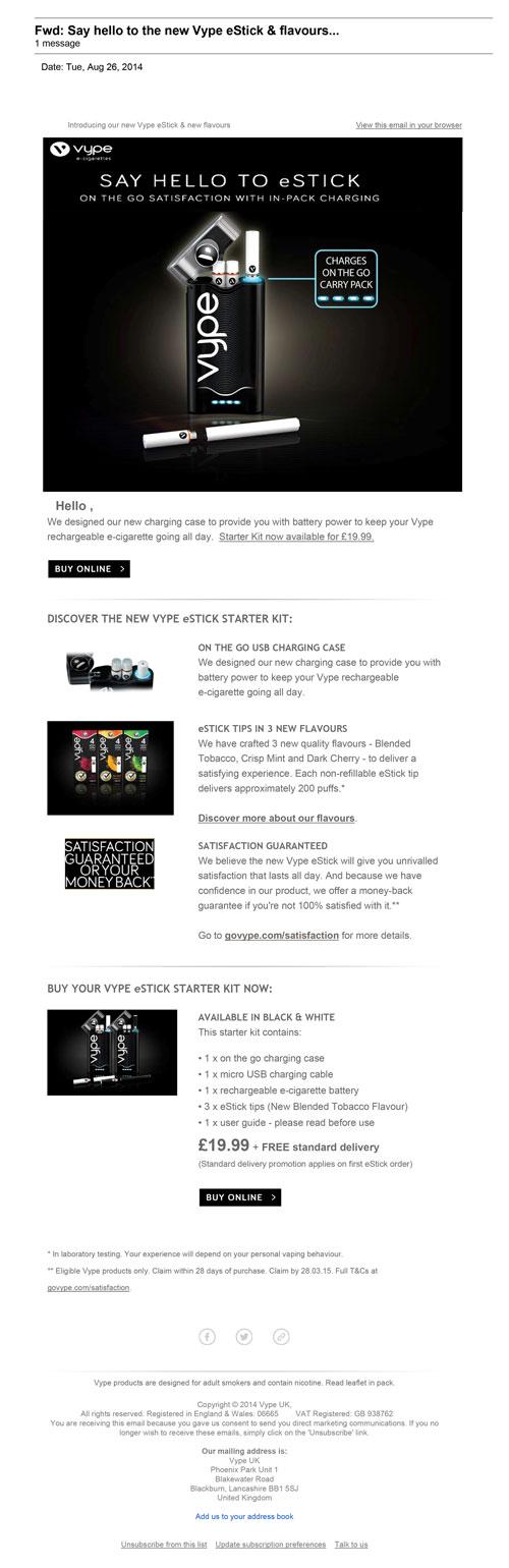 Email received from Vype August 26, 2014 informing user about the new carry pack that also functions as a charger. The email contains links to the website to discover more and buy online.