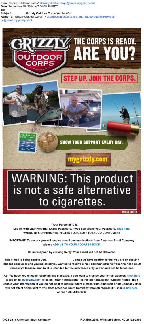 Email from Grizzly on September 30, 2014 inviting the user to "step up" and join the Grizzly Outdoor Corps. Images showing men hunting and fishing are included. Text: "The Corps is ready. Are you?"