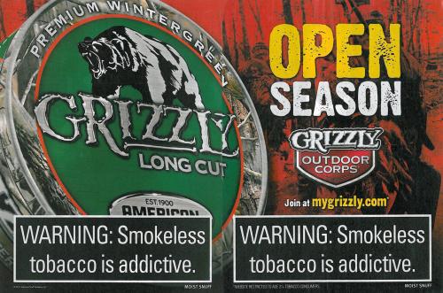 Grizzly advertisement promoting their long cut wintergreen style and the Grizzly Outdoor Corps. Ad invites readers to join at mygrizzly,com. Text: "Open Season"