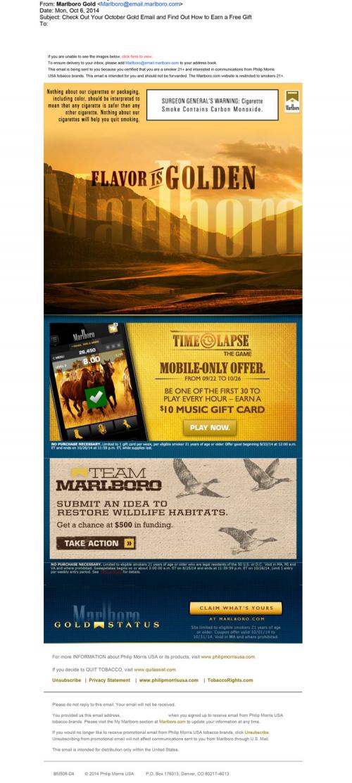 Email received from Marlboro October 2014 promoting Marlboro Gold. Text: "Flavor is Golden." E-mail also promotes the "Time Lapse" mobile game where users can win a 10$ music gift card if they are one of the first 30 players every hour. Lastly email reminds users to apply for the next Team Marlboro Project, where users win $500 to help restore wildlife habitats.