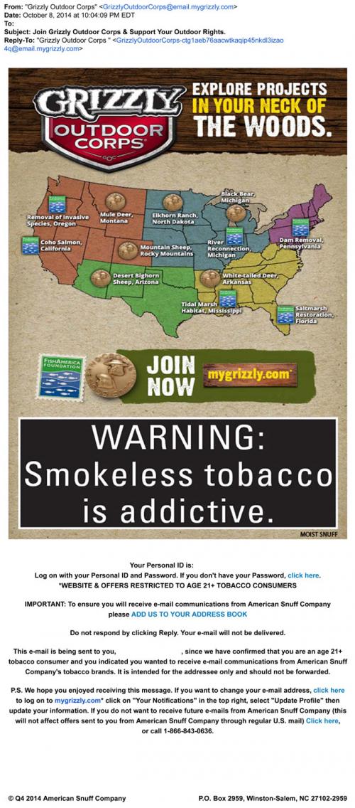 Email received from Grizzly on October 8, 2014 promoting their Outdoor Corps projects. They invite the user to visit the website, join up, and explore environmental service projects in their region of the US. Text: "Explore projects in your neck of the woods."