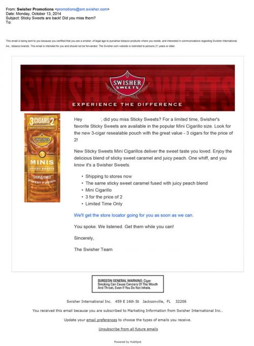 E-mail from Swisher received on October 13, 2014 promoting Mini Sticky Sweets, a caramel and peach flavor cigarillo. E-mail lets users know that this flavor is back by popular demand for a limited time and it is at a special price, 3 for the price of 2.